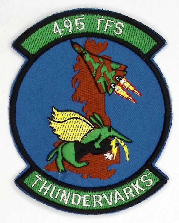 USAF 495 TFS Fighter Patch USAFE 495 TFS Tactical Fighter Squadron Thundervarks RAF Lakenheath F 111 Aardvark 1980s Emb on twill cut edge 100mm by 80mm three and fifteen sixteenth inches by three and three sixteenths inches