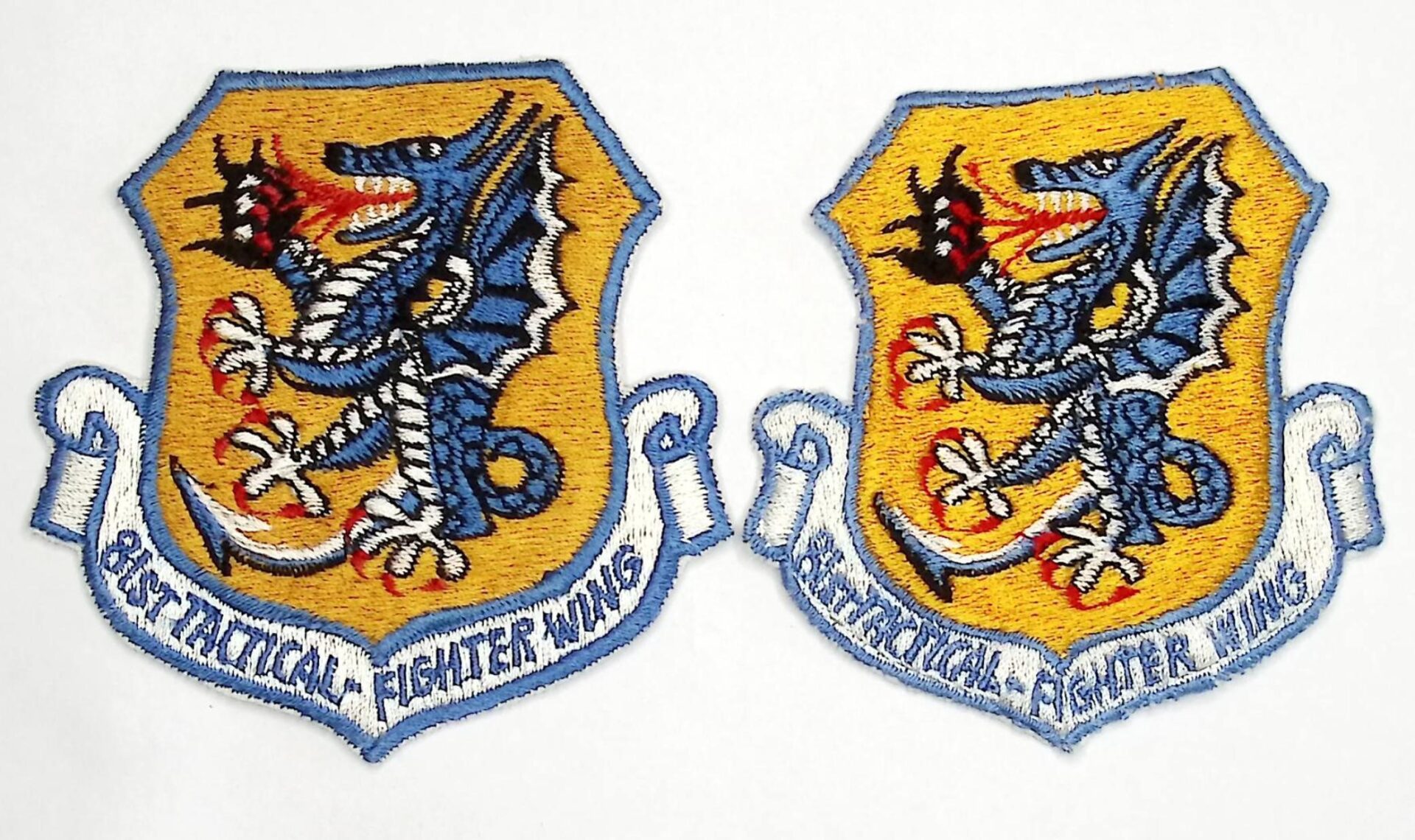 USAF Patch USAFE 81 TFW Tactical Fighter Wing Crest RAF Bentwaters Woodbridge F 101 Voodoo Early 1960s Japanese Ace Novelty  Label Fully embroidered cut edge 91 by 92mm three and nine sixteenth by three and nine sixteenths.