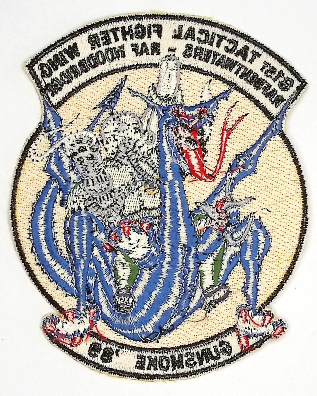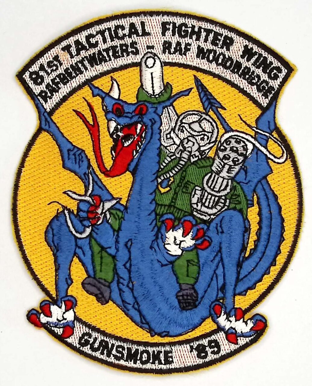 This USAF 81 TFW Gunsmoke patch dates from 1989 with black lettering on white tabs for aircrew.